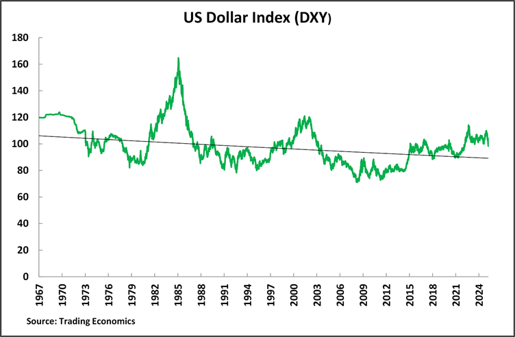 On April 1, the day before Trump’s tariff announcements, the dollar index exchange rate was 104.3 – its recent peak was 110 in January 2025.