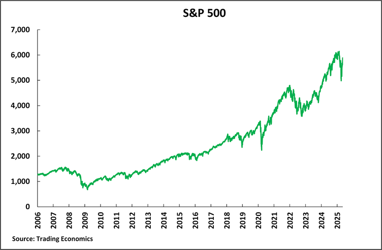 Turning to U.S. share prices, Figure 4 shows the data for the S&P 500 from prior to the international financial crisis to the latest data, that is, from 2006 to May 2025. It may be seen that in this almost 20-year period there were four major episodes of falling prices. Prior to the fall, which has been taking place in 2025, these three were the following: