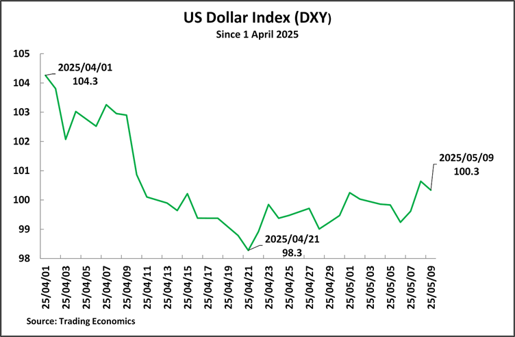 However, after Trump’s tactical tariff retreat, by 1 May the dollar index recovered to 100.2 – back in its previous trading range. Trump’s tactical retreat was therefore able to limit the fall in the US dollar’s exchange rate. By May 9, the last trading day before the announcement of the 90-day U.S. – China trade agreement, the DXY was 100.3. On the last trading day at the time of writing, 23 May, the DXY was 99.1 – within the dollar’s trading range in the last three years.
