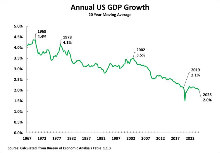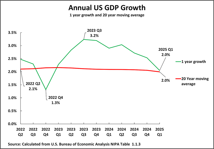Taking U.S. GDP data, Figure 8 shows that the overwhelmingly strong trend in U.S. economic growth is a gradual slowdown that has been continuing for almost six decades. The annual average U.S. GDP growth rate, taking a long-term moving average to remove the effect of short-term business cycle fluctuations, has more than halved in that period, declining from 4.4% in 1969 to 3.5% by 2002 and 2.0% by the latest data for the first quarter of 2025.