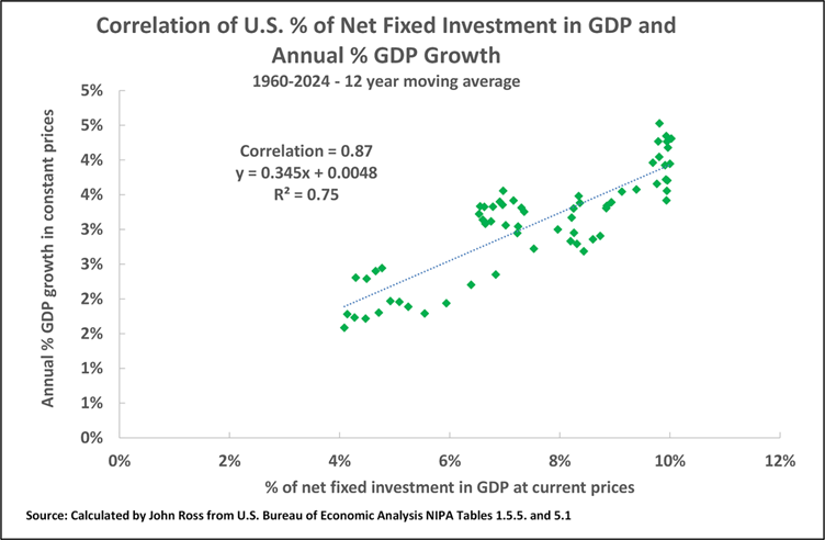 Turning to shorter term movements, as shown in Figure 11, the correlation between the annual percentage of net fixed investment in GDP and the annual average U.S. GDP % growth rate, taking a six-year average GDP growth rate, is 0.78 – six years is taken in this graph as the period for the moving average to correspond to the same length of time, 2019 to 2025, which has elapsed since the peak of the previous U.S. business cycle. As would be anticipated from previous factual data, if a longer period is taken, the correlation is even higher – the correlation for a 10-year period is 0.81 and for a 20-year period it is 0.82.