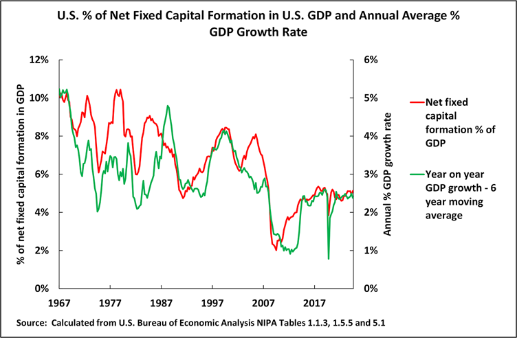 The longer term relation of the percentage of net fixed capital formation in U.S. GDP and the U.S. GDP growth rate