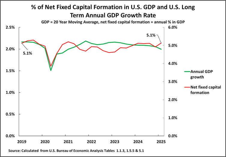 Bearing in mind this relation, Figure 12 then shows that since the peak of the last U.S. business cycle in 2019 to the latest data for the first quarter of 2025 there has been no decline in the percentage of net fixed capital formation in U.S. GDP – it was 5.1% of U.S. GDP at both the beginning and the end of the period. Therefore, there has been no change in the factor that is most closely correlated with GDP growth in the United States. There is, therefore, no factual trend that would indicate that there should be a downturn in the present long-term average growth rate of U.S. GDP – which, as already seen, is slightly above two percent a year.