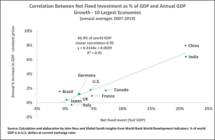 Thus far, specifically, the growth pattern of the U.S. has been analysed. However, it should be clearly understood that this very high correlation of the percentage of net fixed capital formation in GDP and GDP growth in the U.S. is not exceptional, but is in line with all other major economies, including China.