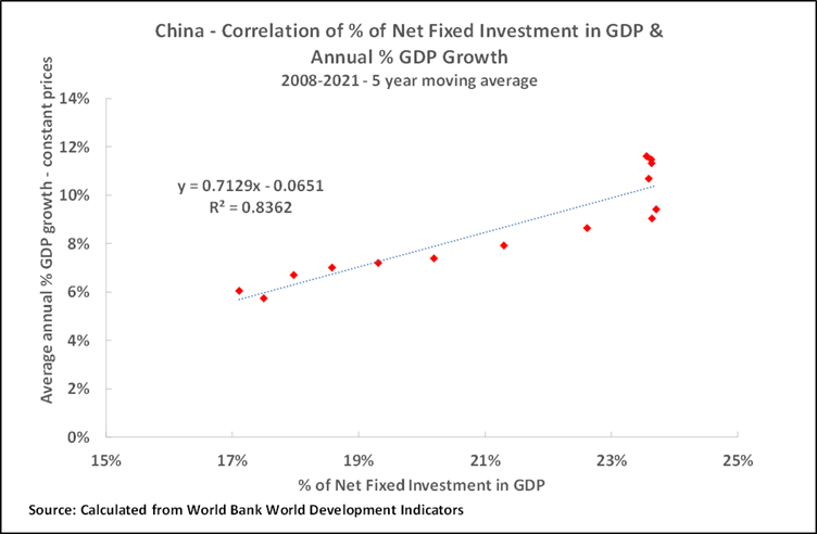 That is, the long-term growth rates of both China and the U.S., as with all very large economies, are closely and positively correlated with the percentage of net fixed capital formation in GDP. It is unnecessary for the present purposes to determine the direction of causality in this – whether the percentage of net fixed capital formation in GDP determines the GDP growth rate, the GDP growth rate determines the percentage of net fixed capital formation in GDP, or some other factor(s) determine both. However, this means that China’s GDP growth rate cannot be accelerated without increasing the percentage of net fixed capital formation in GDP, and that any reduction in the percentage of net fixed capital formation in GDP will lower the economic growth rate.