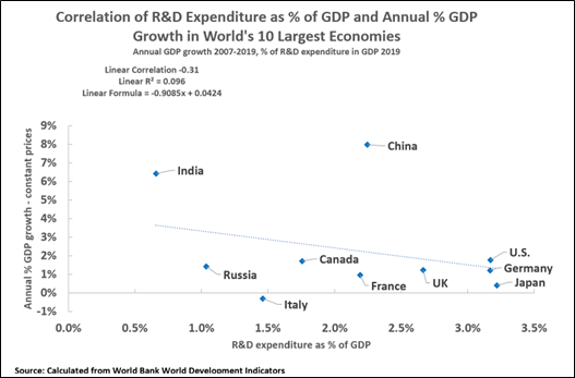 To illustrate this point, Figure 17 shows the correlation between the percentage of R&D, which is the key to innovation, in GDP and annual GDP growth for the world’s 10 largest economies. As can be seen, there is only an extremely low/no significant correlation between the percentage of the economy spent on R&D and GDP growth; the correlation is -0.31 and the R squared is 0.01. In other words, there is no evidence of a direct influence of R&D on GDP growth. This correlation is in direct contrast to the data above, which showed an extremely close relationship (0.95) between the percentage of net fixed capital formation in GDP and GDP growth in the same ten largest economies.