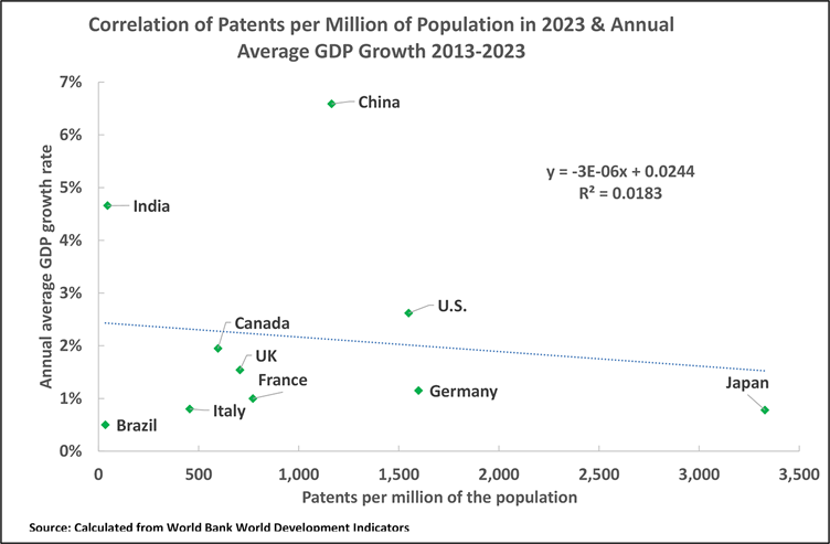 Regarding patents, China has a medium number of patents per million of the population but a fast growth rate, Japan has a very high number of patents per million of the population and a very low growth rate, and India has a very low number of patents per million of the population and the second highest GDP growth rate after China. In other words, as confirmed by the data, there is no consistent relationship between the number of patents and the speed of GDP growth.