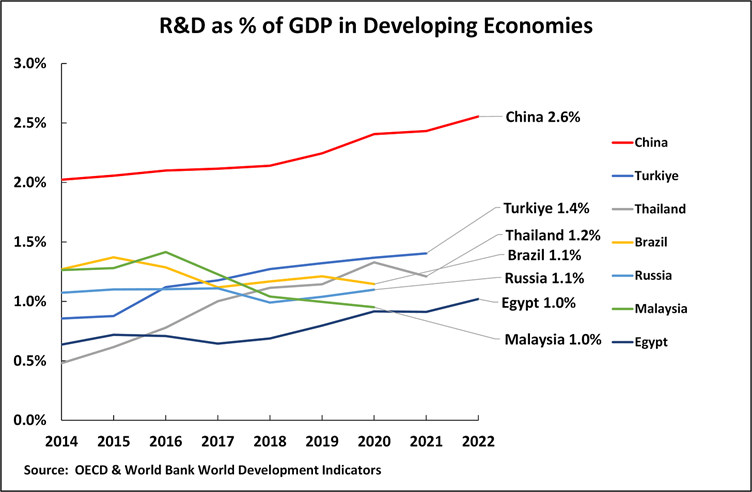 Does this imply that innovation is not important for economic growth? Obviously not. China’s technological upgrading and its development of new productive forces reflect its overwhelming lead in its percentage of R&D in GDP among developing countries (see Figure 19). According to the latest OECD data, China’s percentage of GDP spent on R&D (2.6%) is almost double that of the second most developed economy, Turkiye at 1.4%, and is more than twice that of fellow BRICS economies Brazil and Russia at 1.1% each. That is, as a percentage of the economy, China has a huge lead in R&D spending compared with any other developing country.