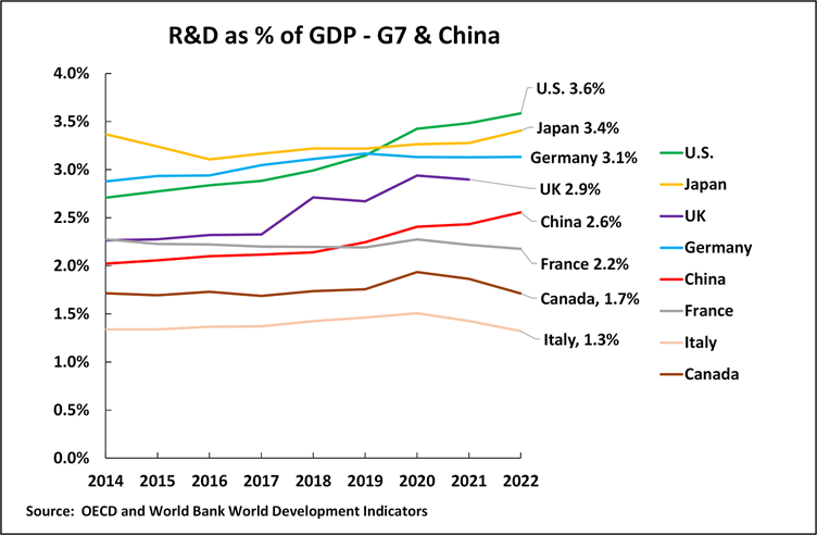 It will take a significant period of time for China to catch up with all the leading G7 economies in the proportion of the economy spent on R&D, as developing this does not depend only on financial resources but on the existence of very large numbers of highly educated, trained, and skilled researchers and scientists who cannot be produced extremely rapidly. It takes 20 years from someone entering school to emerging with a PhD in engineering or mathematics, which are the types of key qualifications required for advanced R&D. Therefore, closing this gap will take years.