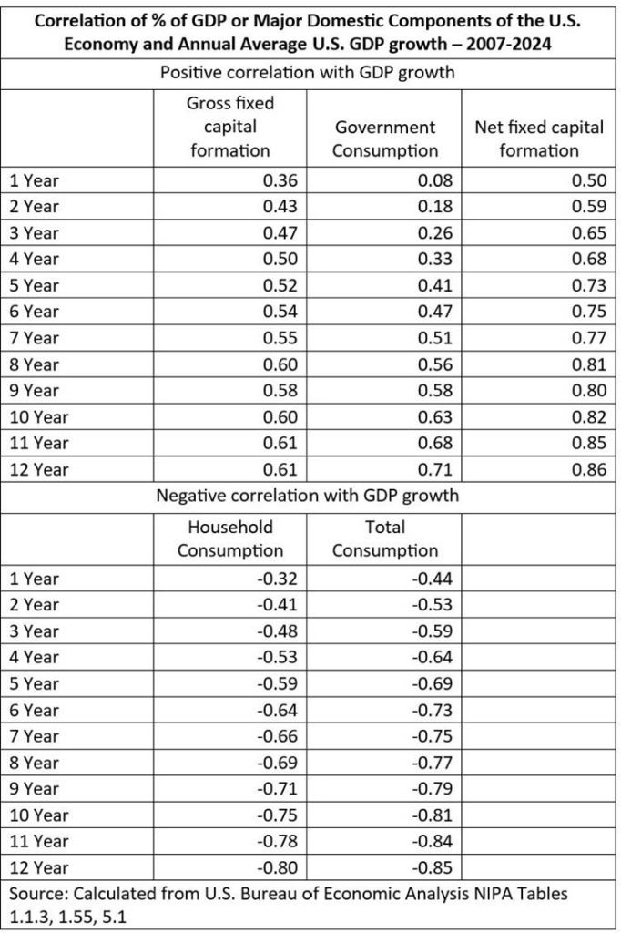 By the medium term, in contrast, some correlations between the percentages of major components of U.S. GDP and its economic growth rate have become high or close to high. Taking a five-year period, the positive correlation between the percentage of net fixed capital formation in GDP and GDP growth has become a high 0.73, and the negative correlation between the percentage of consumption in GDP and GDP growth has become 0.69.