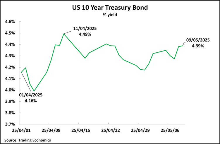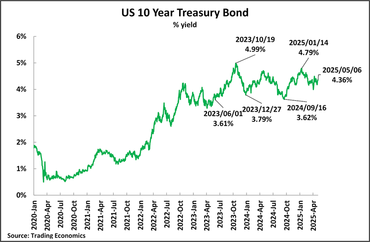 Turning in more detail to the period from April 1, that is, the day before Trump’s “reciprocal tariff” announcements on April 2, Figure 3 shows that nothing has occurred, which takes Treasury bond prices outside the previous trading range. On April 1, the yield was 4.16%, which rose sharply to 4.49% by April 11, but then fell; by May 6, it was only 4.36%, comfortably within the last two years, with a trading range of 3.6%-5.0%. On May 9, the last trading day before the announcement of the 90-day–US China trade agreement, the yield was 4.39%. On the last trading day at the time of writing, 23 May, the yield was 4.50% – entirely within the range in which the 10-year Treasury has been trading for the last two years.